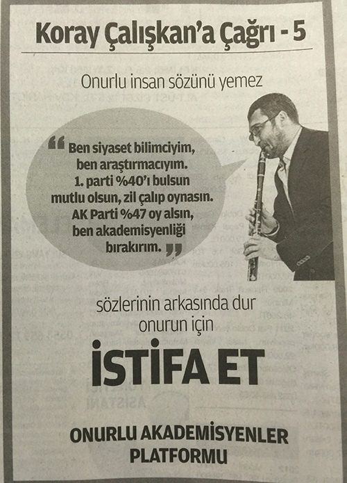 'Onurlu İnsan sözünü yemez' başlığı ile verilen ilanda Koray Çalışkan'n 1 Kasım öncesi yaptığı "Ben siyaset bilimciyim, ben araştırmacıyım. 1. parti yüzde 40'ı bulsun mutlu olsun, zil çalıp oynasın. AK Parti yüzde 47 oy alsın ben akademisyenliği bırakırım" açıklama hatırlatılarak sözlerinin arkasında dur istifa et çağrısnda bulundu.