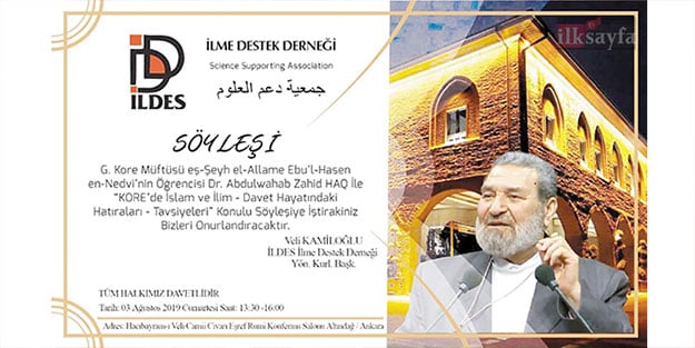 İlme Destek Derneği (İLDES) Ankara’da önemli bir konferans düzenleyecek. 3 Ağustos Cumartesi günü saat 13.30’da Hacı Bayram Camii Eşref Rumi konferans salonunda, Güney Kore Müftüsü Dr. Abdulwahab Zahid Haq, Kore’de Müslümanlık ve Türkiye- Kore ilişkilerinin konu edileceği bir konferans verecek.