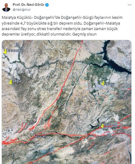 "Malatya Küçüklü- Doğanşehir’de Doğanşehir-Sürgü faylarının kesim yöresinde 4,7 büyüklükte sığ bir deprem oldu. Doğanşehir-Malatya arasındaki fay zonu stres transferi nedeniyle zaman zaman küçük depremler üretiyor, dikkatli olunmalıdır. Geçmiş olsun"