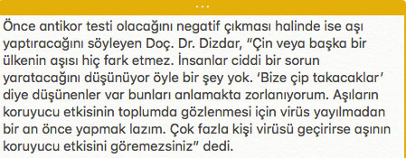 İstanbul Üniversitesi Onkoloji Enstitüsü’nden Radyasyon Onkolojisi Uzmanı Doç. Dr. Yavuz Dizdar ise aşıların herhangi bir zararının olmadığını söyleyerek, antikor testinin negatif çıkması halinde aşı olacağını açıkladı. Üreme çağında olan kişilerin aşıdan muaf tutulmasını öneren Doç. Dr. Dizdar, “Yani aşılamaya belli bir yaşın üstündeki insanlardan başlansın. İngiltere ve Almanya aynı yöntemi izledi. Bu ülkeler 80 yaş ve üstündeki kişileri aşılayarak başladı. Bizde de 70-80 yaş makul bir sınırdır. Gönüllü olarak aşı olmak isteyen de yine aşı olur. Olumsuz herhangi bir yan etkisi olursa da bunu ancak 6 ay ile 1 yıl sonra görebiliriz” ifadelerini kullandı.