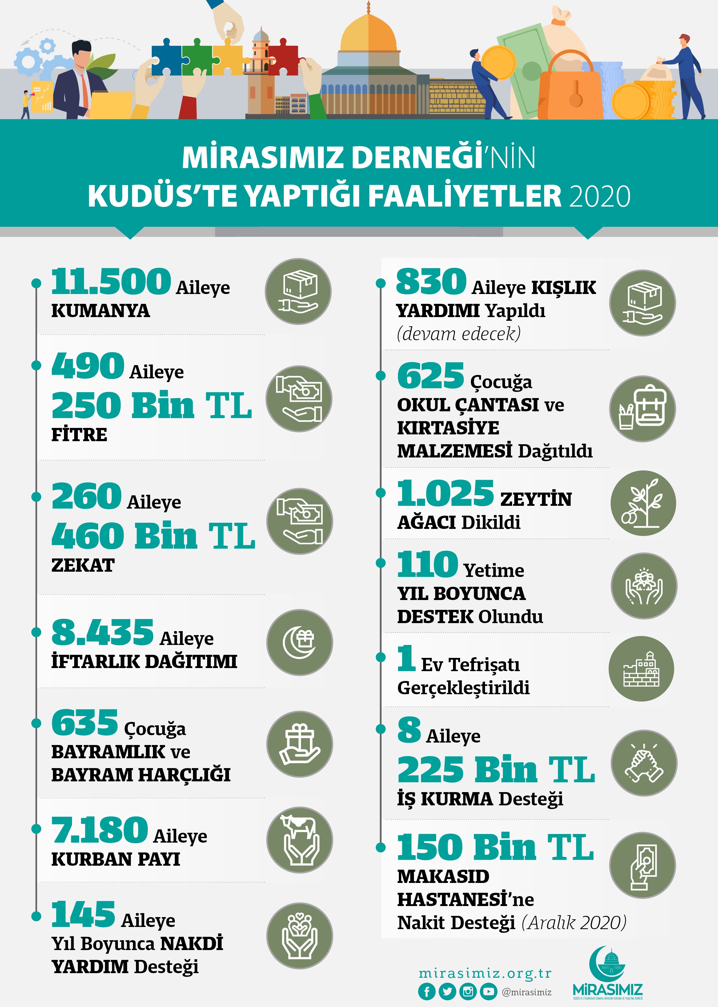 ”5075’i Ramazan ayında olmak üzere toplamda 11.500 Aileye Kumanya paketi ulaştırıldı. Bağışçılarımızın emanetleri olan 250.000 TL fitreyi 490 aileye, 460.000 TL zekâtı da 260 aileye elden teslim ettik. Her yıl Mescid-i Aksa’nın alanında kurduğumuz iftar sofralarını, koronavirüs önlemleri çerçevesinde Mescid-i Aksa Kudüslülerin ibadetine kapatılınca, mahallelerde kurduğumuz aşevleri aracılığı ile sıcak iftar yemeklerini 8435 ailenin evlerine ulaştırdık. Kurban bayramında 7180 ailenin evine kurban payı ulaştırdık. Yıl boyunca 145 aileye nakdi destek sağladık. 830 aileye kışlık yardımı gerçekleştirdik (Bu çalışmamız halen devam ediyor). Gönüllerimizin destekleri ile 1 ev tefrişatı yaptık.