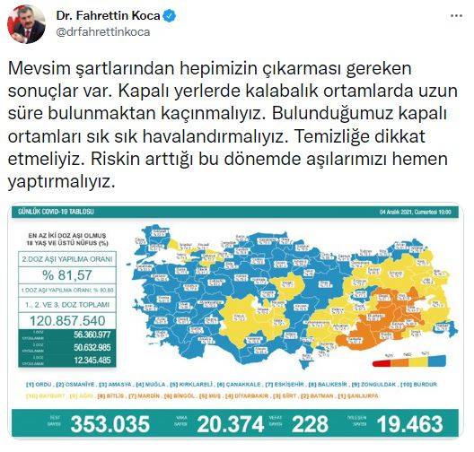 Sağlık Bakanı Fahrettin Koca, sosyal paylaşım sitesi Twitter hesabından yaptığı paylaşımda, “Mevsim şartlarından hepimizin çıkarması gereken sonuçlar var. Kapalı yerlerde kalabalık ortamlarda uzun süre bulunmaktan kaçınmalıyız. Bulunduğumuz kapalı ortamları sık sık havalandırmalıyız. Temizliğe dikkat etmeliyiz. Riskin arttığı bu dönemde aşılarımızı hemen yaptırmalıyız” dedi.