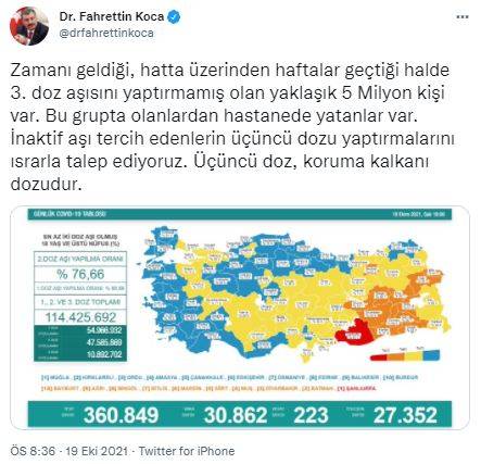 Sağlık Bakanı Koca, sosyal paylaşım sitesi Twitter hesabından yaptığı paylaşımda, “Zamanı geldiği, hatta üzerinden haftalar geçtiği halde 3. doz aşısını yaptırmamış olan yaklaşık 5 milyon kişi var. Bu grupta olanlardan hastanede yatanlar var. İnaktif aşı tercih edenlerin üçüncü dozu yaptırmalarını ısrarla talep ediyoruz. Üçüncü doz, koruma kalkanı dozudur” dedi.
