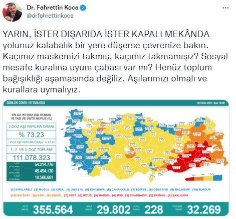 Sağlık Bakanı Fahrettin Koca, sosyal paylaşım sitesi Twitter hesabından yaptığı paylaşımda, “Yarın, ister dışarıda ister kapalı mekanda yolunuz kalabalık bir yere düşerse çevrenize bakın. Kaçımız maskemizi takmış, kaçımız takmamışız? Sosyal mesafe kuralına uyum çabası var mı? Henüz toplum bağışıklığı aşamasında değiliz. Aşılarımızı olmalı ve kurallara uymalıyız” dedi.