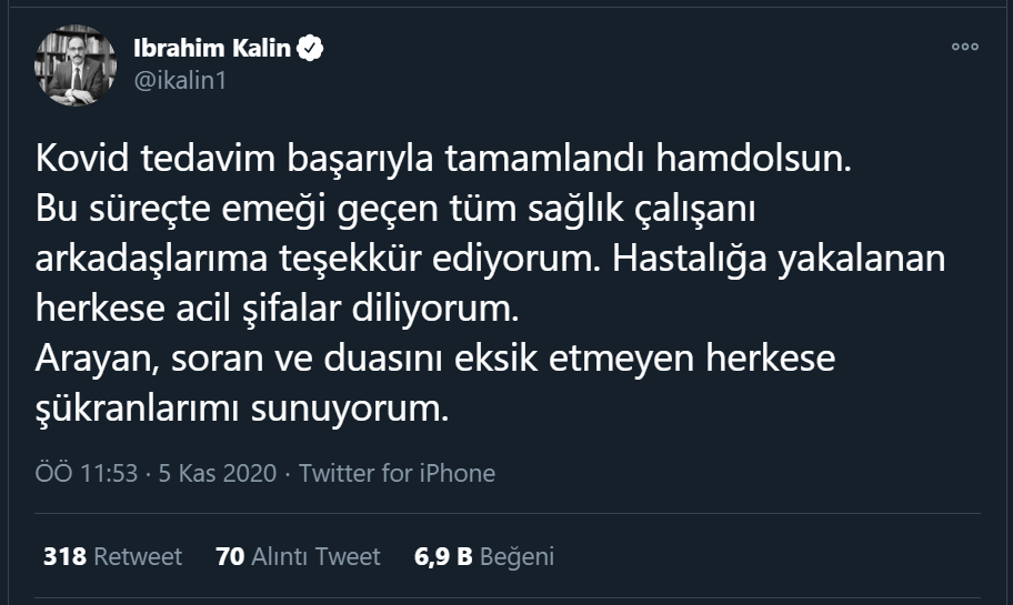 Kalın, Twitter hesabından yaptığı paylaşımda, "Kovid tedavim başarıyla tamamlandı hamdolsun. Bu süreçte emeği geçen tüm sağlık çalışanı arkadaşlarıma teşekkür ediyorum. Hastalığa yakalanan herkese acil şifalar diliyorum. Arayan, soran ve duasını eksik etmeyen herkese şükranlarımı sunuyorum." ifadelerini kullandı.