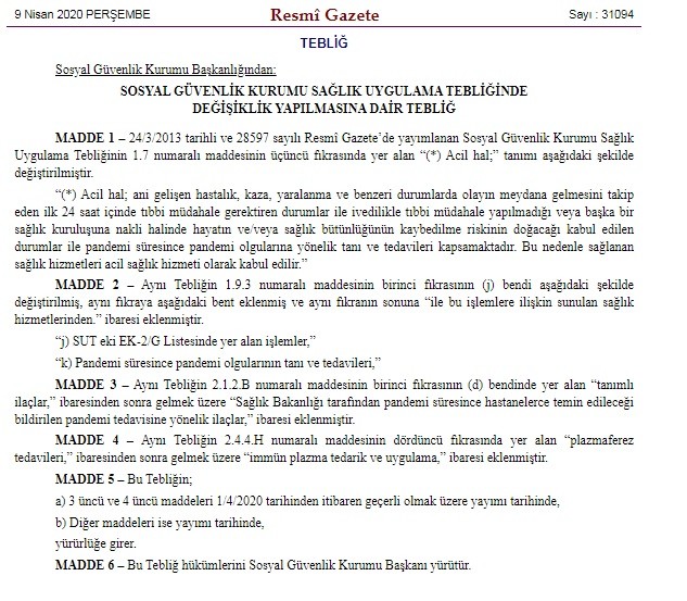 Sağlık Uygulama Tebliğinde (SUT) Değişiklik Yapılmasına Dair Tebliğ, Resmi Gazete'de yayımlanarak yürürlüğe girdi. Buna göre tebliğin 1.7 numaralı maddesinin üçüncü fıkrasında yer alan "acil hal" tanımı yeniden yapılarak salgın hastalıklar da acil sağlık hizmeti kapsamına alındı. Yeni tip koronavirüs (Kovid-19) vakalarının "acil hal" olarak kayıtlara geçmesini sağlayan yeni "acil hal" tanımı SUT'ta şu şekilde yapıldı: