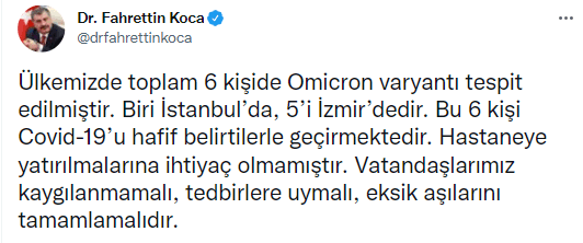 "Ülkemizde toplam 6 kişide Omicron varyantı tespit edilmiştir." diyen Koca, "Biri İstanbul’da, 5’i İzmir’dedir. Bu 6 kişi Covid-19’u hafif belirtilerle geçirmektedir. Hastaneye yatırılmalarına ihtiyaç olmamıştır. Vatandaşlarımız kaygılanmamalı, tedbirlere uymalı, eksik aşılarını tamamlamalıdır." ifadelerini kullandı.