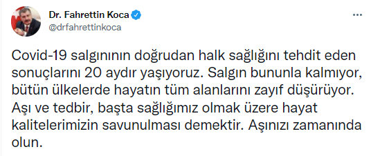 Koronavirüs verilerini Twitter hesabından paylaşan Sağlık Bakanı Fahrettin Koca, "Covid-19 salgınının doğrudan halk sağlığını tehdit eden sonuçlarını 20 aydır yaşıyoruz. Salgın bununla kalmıyor, bütün ülkelerde hayatın tüm alanlarını zayıf düşürüyor. Aşı ve tedbir, başta sağlığımız olmak üzere hayat kalitelerimizin savunulması demektir. Aşınızı zamanında olun." dedi.