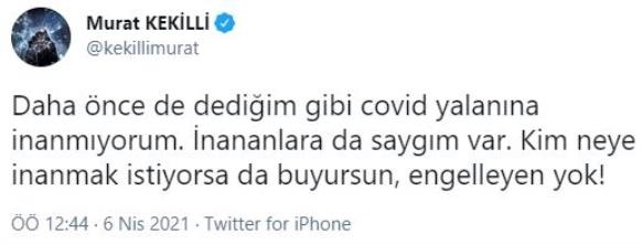 Kekilli, "Daha önce de dediğim gibi Kovid yalanına inanmıyorum. İnananlara da saygım var. Kim neye inanmak istiyorsa da buyursun, engelleyen yok" ifadelerini kullandı.