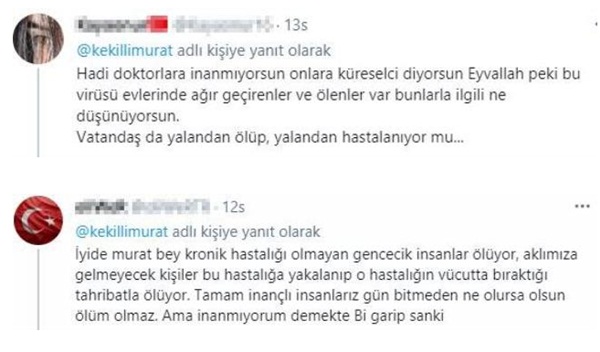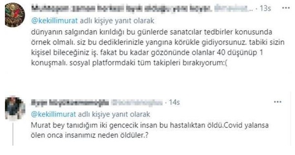 Kekilli'nin bu çıkışı kısa sürede gündem olurken sosyal medya kullanıcıları da ikiye bölündü. Kullanıcıların bir kısmı Kekilli'ye hak verirken bir kısmı da "Doktorlara inanmıyorsun tamam ama ölenlere de inanmıyorsun" diyerek tepki gösterdi.