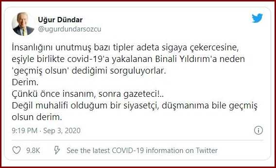 "İnsanlığını unutmuş bazı tipler adeta sigaya çekercesine, eşiyle birlikte Covid-19'a yakalanan Binali Yıldırım'a neden 'geçmiş olsun' dediğimi sorguluyorlar. Derim. Çünkü önce insanım, sonra gazeteci!.. Değil muhalifi olduğum bir siyasetçi, düşmanıma bile geçmiş olsun derim."