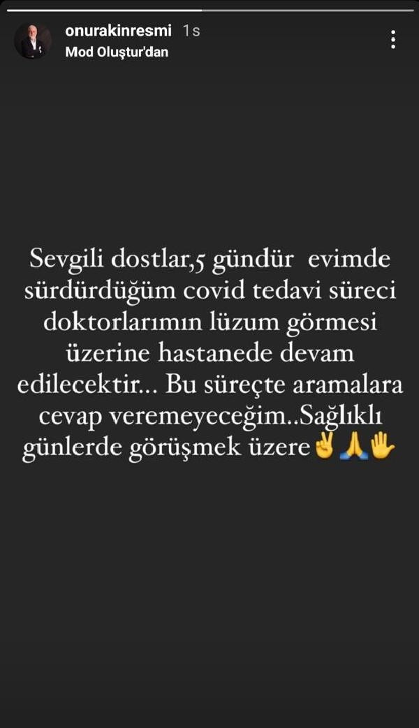 Koronavirüs testi pozitif çıkan sanatçı Onur Akın sosyal medya hesabından yaptığı açıklamada hastaneye kaldırıldığını açıkladı.
