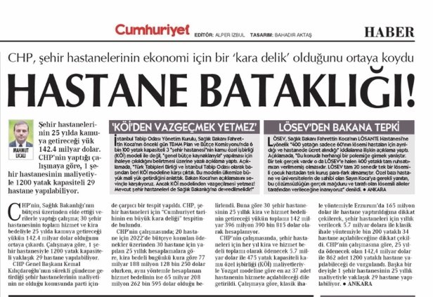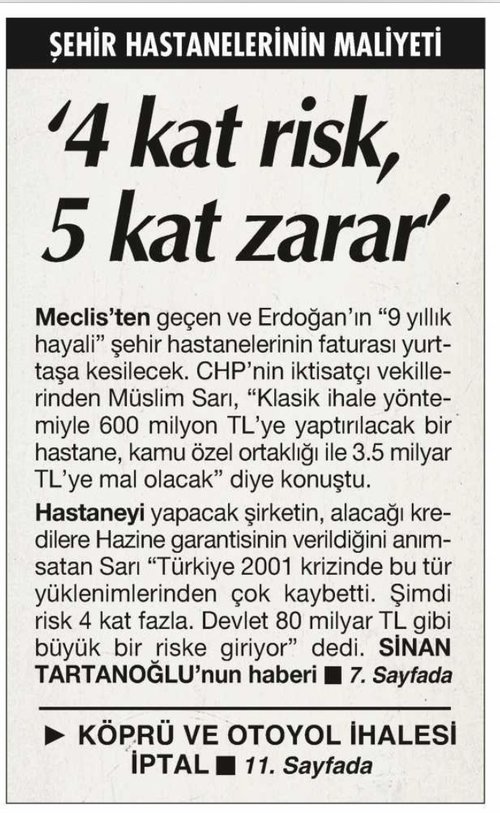 22 Şubat 2013: CHP İstanbul Milletvekili Müslim Sarı, Meclis'te kabul edilen şehir hastaneleri yasası ile ilgili olarak, "Klasik ihale yöntemiyle 600 milyon TL'ye yaptırılacak bir hastane, kamu özel ortaklığı ile yaklaşık 3.5 milyar TL'ye mal olacak. Yani yaklaşık 5 kat zarar edilecek. Yabancı şirketlere verilen hazine garantisi ile ise devlet, 2001 krizinde batık bankaların mal olduğu 20 milyar TL'lik açığın 4 katı kadar riski üstlenecek. Zarar ve risk doktorun emeğinden yurttaşın da cebinden karşılanacak" iddiasında bulundu.