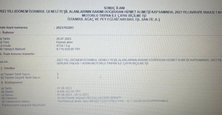 - 1 Ağustos 2023 tarihinde Ağaç A.Ş.’den 9 milyon 568 bin 422 TL ihale alan Ömürcan Danışman’a ait Su Botanik A.Ş. ise skandal iyice ayyuka çıktıktan sonra 4 Mart 2024’te “İstanbul Avcılar Tahtakale Mahallesi Vali Recep Yazıcıoğlu Caddesi No: 6/1” nolu adresi değiştirmiş.