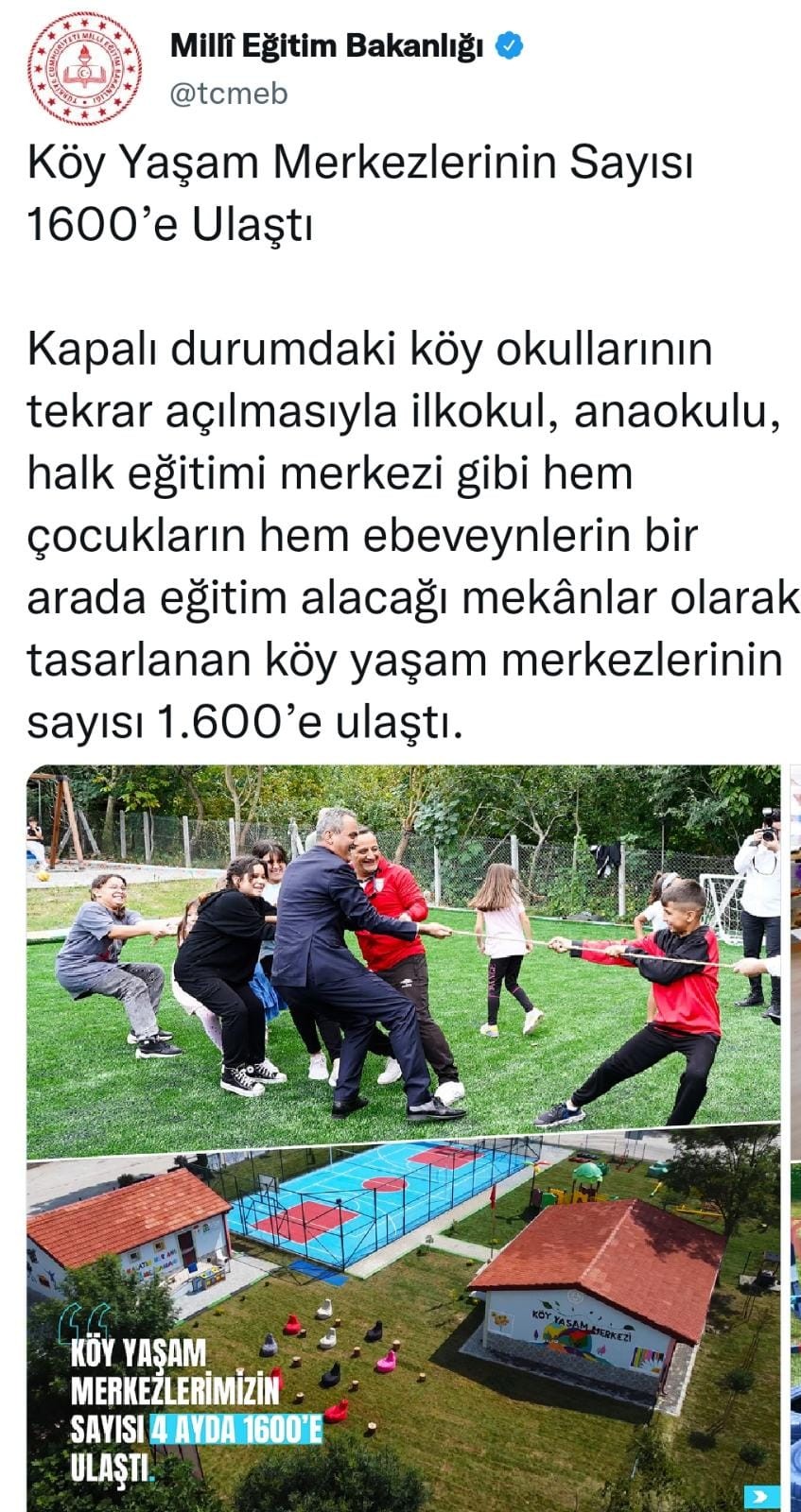 Kapalı durumdaki köy okullarının tekrar açılarak ilkokul, anaokulu, halk eğitimi merkezi gibi hem çocukların hem ebeveynlerin bir arada eğitim alacağı mekânlar olarak tasarlanan köy yaşam merkezlerinin sayısı 1600'e ulaştı.
