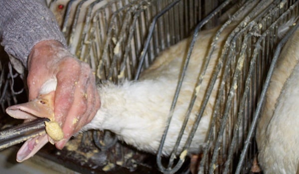 Bu beslenme yönteminde kuşların midelerine her gün 2 kilo tahıl, boğazlarından aşağı sokulan metal borular aracılığıyla pompalanır ve öldürülmeden önce karaciğerlerinin şişmesine neden olur.