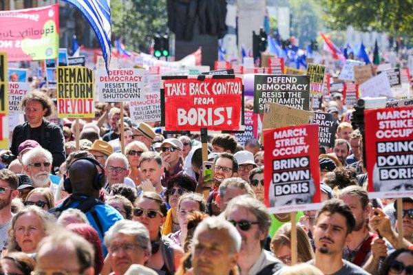 "Demokrasiyi savun, parlamentonun kapatılmasına diren", "Boris'i devir", "İngiliz halkı parlamentoyu seçti, Boris Johnson'ı seçmedi", "Brexit'i durdur, Boris'i durdur" yazılı döviz ve pankartlar taşıyan göstericilere, muhalefet partilerinden milletvekilleri de destek verdi.