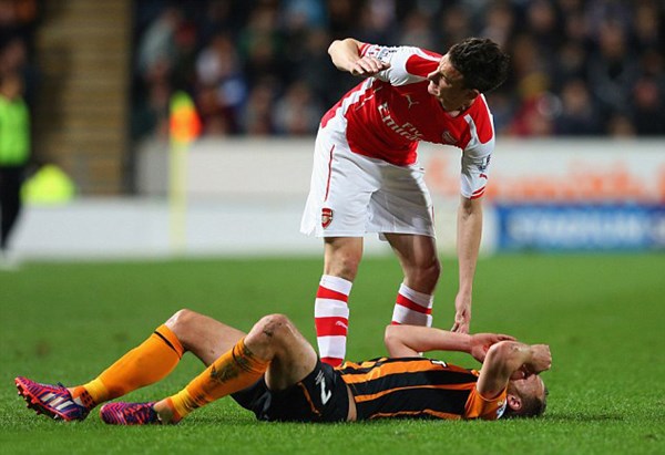 Arsenal'li Laurent Koscielny, bir pozisyon sırasında yere düşen Hull City orta sahası David Meyler'in suratına bastı. Darbesonrası David Meyler'in gözünün altı yarıldı.