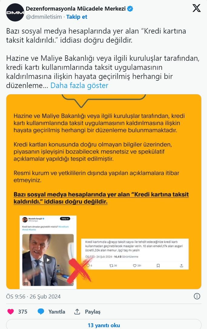 Dezenformasyonla Mücadele Merkezinden yapılan açıklamada, bazı sosyal medya hesaplarında yer alan "kredi kartına taksit kaldırıldı" iddiasının doğru olmadığı belirtildi.