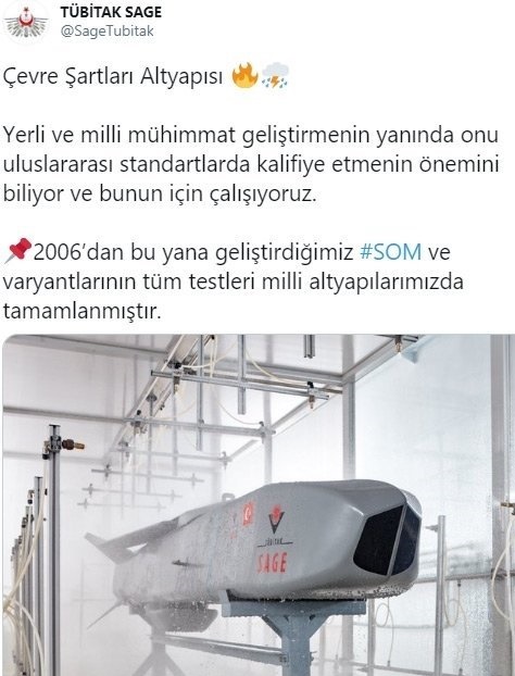 "Yerli ve milli mühimmat geliştirmenin yanında onu uluslararası standartlarda kalifiye etmenin önemini biliyor ve bunun için çalışıyoruz. 2006'dan bu yana geliştirdiğimiz #SOM ve varyantlarının tüm testleri milli altyapılarımızda tamamlanmıştır."
