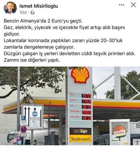 "Benzin Almanya'da 2 euroyu geçti. Gaz, elektrik, yiyecek ve içecekte fiyat artışı aldı başını gidiyor. Lokantalar koronada yaptıkları zararı yüzde 20-30'luk zamlarla dengelemeye çalışıyor. Düzgün çalışan iş yerleri devletten ciddi teşvik primleri aldı. Zammı ise diğerleri yaptı."