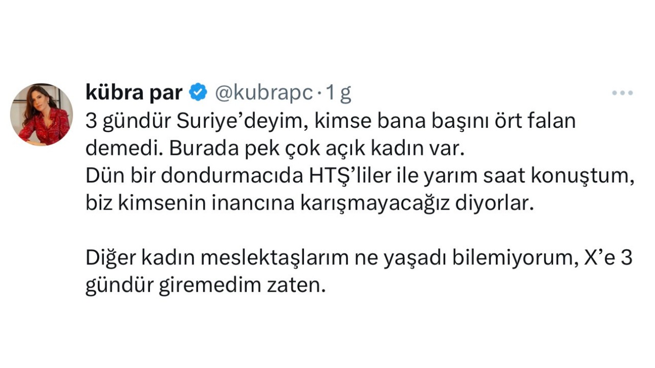 Türkiye’den bölgeye giden gazeteci Kübra Par Twitter paylaşımında, “3 gündür Suriye’deyim, kimse bana başını ört falan demedi. Burada pek çok açık kadın var. Dün bir dondurmacıda HTŞ’liler ile yarım saat konuştum, biz kimsenin inancına karışmayacağız diyorlar. Diğer kadın meslektaşlarım ne yaşadı bilemiyorum, X’e 3 gündür giremedim zaten.” ifadelerini kullandı.
