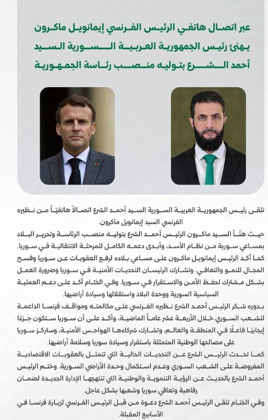Pentagon'un asker çekme kararı sonrası YPG'yi Fransa da sattı. Fransa Cumhurbaşkanı Emmanuel Macron, Suriye Geçiş Dönemi Cumhurbaşkanı Ahmed Şara'yı tebrik edip Paris'e davet etti. Bu durum Fransa'nın ABD desteği olmadan bölgede varlık sürdüremeyeceğini gözler önüne serdi. Akıllara Dışişleri Bakanı Hakan Fidan'ın "Amerika'nın şemsiyesi altındaki küçük ülke Fransa. Amerika'nın olmadığı bir yerde kendileri bölgeye gelip, operasyon ve askeri güç bulundurabiliyorlarsa, görelim" sözleri geldi.