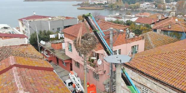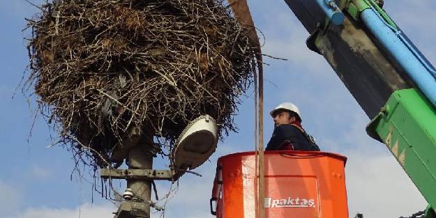 Yıllar önce bir leyleğin yuva yaptığı elektrik direği eskiyince yenisiyle değiştirildi ve yuva da zarar vermeden taşındı.