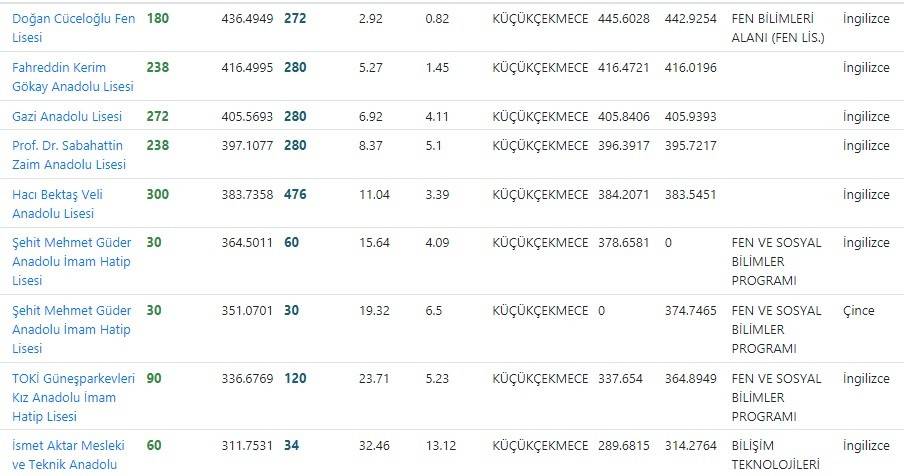 Küçükçekmece lise puanları yüzdelik dilimleri kontenjanları