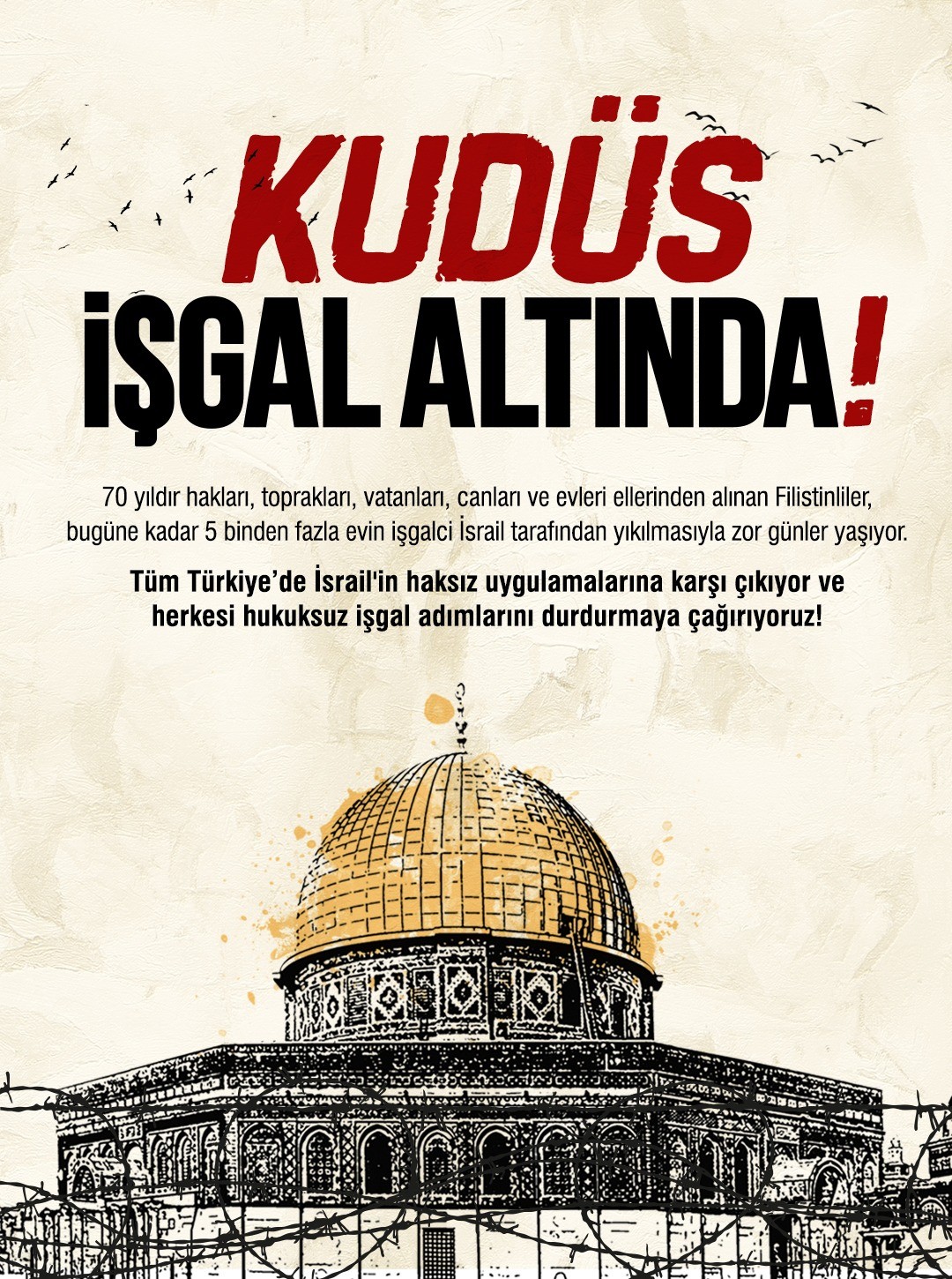 Tüm Türkiye’de İsrail’in haksız uygulamalarına karşı çıkıyor ve herkesi hukuksuz işgal adımlarını durdurmaya çağırıyoruz!