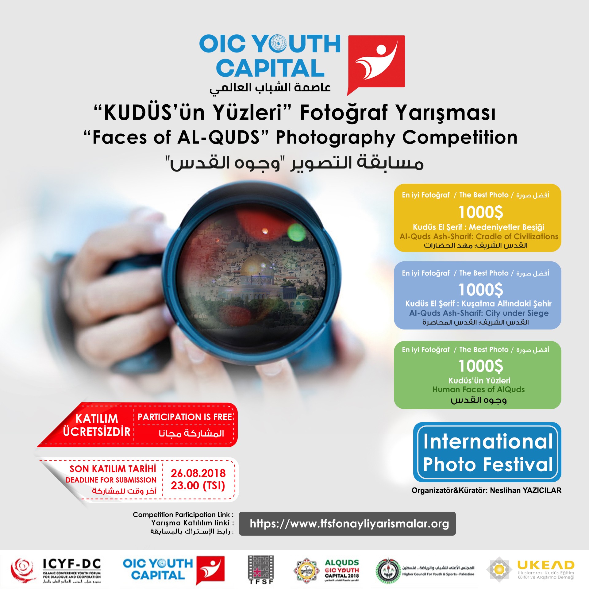 Yazıcılar, Filistin Gençlik ve Spor Yüksek Konseyi, Al-Quds Al-Sharif – OIC, Uluslararası Kudüs Eğitim Kültür ve Araştırma Derneği’nin (UKEAD) de destek verdiği yarışmanın, Türkiye Fotoğraf Sanatı Federasyonu (TFSF) iş birliğinde yapılacağının altını çizdi.