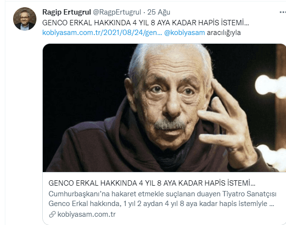 Başta Cumhurbaşkanı Recep Tayyip Erdoğan olmak üzere, İletişim Başkanı Fahrettin Altun, Çevre ve Şehircilik Bakanı Murat Kurum ve diğer hükümet yetkililerine galiz ifadeler kullanıp hakaretler yağdıran Ragıp Ertuğrul ile Nihal Kuyumcu, Kültür ve Turizm Bakanlığı yönetimindeki Özel Tiyatrolar Yardım Komisyonu'na seçildi.