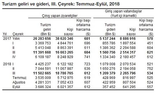 Turizm geliri geçen yılın aynı çeyreğine göre yüzde 1 arttı. Ziyaretçi sayısı geçen yılın aynı çeyreğine göre yüzde 12,7 arttı. Turizm geliri Temmuz, Ağustos ve Eylül aylarından oluşan III. çeyrekte bir önceki yılın aynı çeyreğine göre yüzde 1 artarak 11 milyar 502 milyon 665 bin $ oldu.