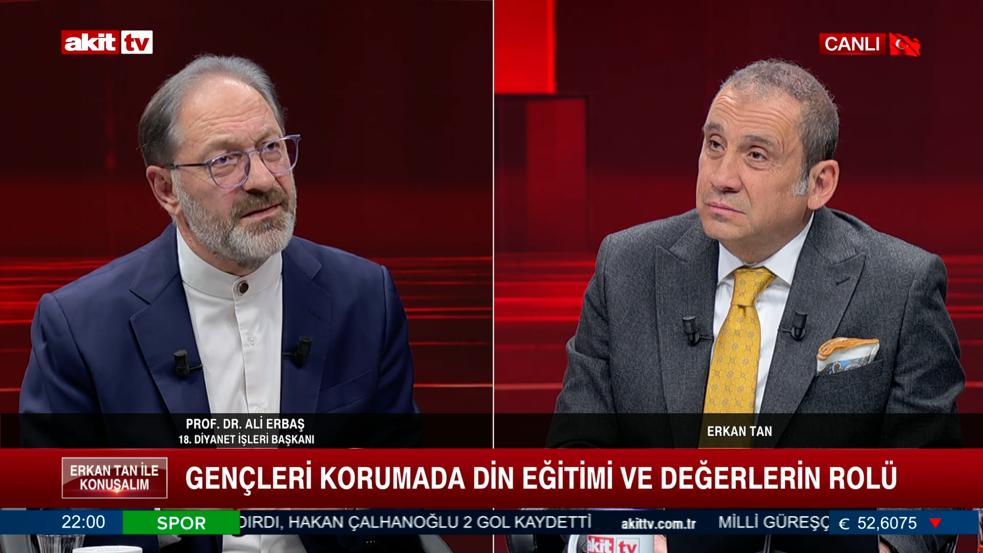 Akit TV'de Erkan Tan ile konuşalım programına katılan eski Diyanet İşleri Başkanı Prof. Dr. Ali Erbaş diyanetin gençler konusundaki durumu hakkında analizlerde bulundu. Erbaş, toplumun temel direği olan aile yapısını ve geleceğimizin teminatı olan gençliği hedef alan kültürel yozlaşmaya karşı sert bir duruş sergiledi. Erbaş, modern çağın getirdiği risklerin ancak manevi değerlerin kalkan yapılmasıyla bertaraf edilebileceğini vurguladı. Diyanet’in yeni dönemde dijitalleşen dünyanın getirdiği tehditlere karşı aile ve gençlik merkezli irşat faaliyetlerine hız vereceği bildirildi.