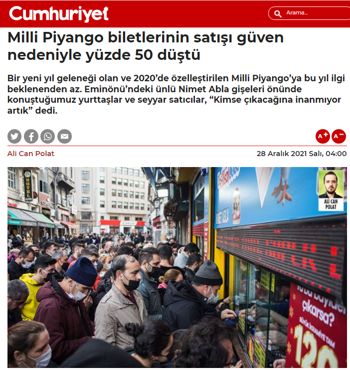 Kumara olan ilgisizliği "Milli Piyango biletlerinin satışı güven nedeniyle yüzde 50 düştü" başlığıyla haberleştiren Cumhuriyet, vatandaşlara kısa yoldan zengin olmanın hayali kurdurarak yılbaşı kumarı oynatan haramzedelerin de açıklamalarına yer vermeyi ihmal etmedi.