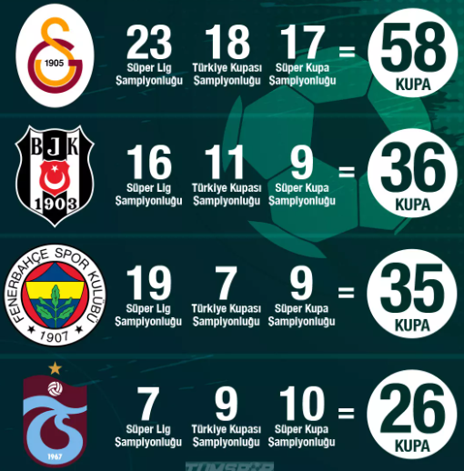 Fenerbahçe'nin 19 Süper Lig, 7 Türkiye Kupası ve 9 Türkiye Süper Kupası bulunurken Beşiktaş'ın ise 16 Süper Lig, 11 Türkiye Kupası ve 9 Türkiye Süper Kupası bulunuyor.