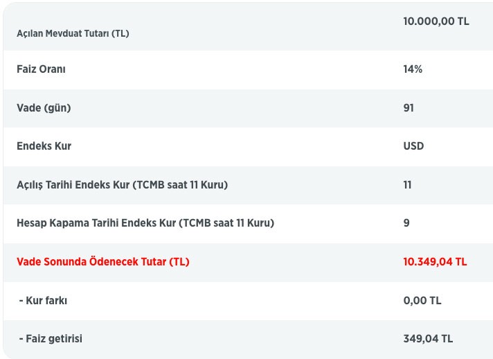 Türkiye Cumhuriyet Merkez Bankası (TCMB) tarafından TSİ 11:00'da açıklanan seçeceğiniz döviz (USD, EUR veya GBP) alış kuru ile hesabın vade sonu TSİ 11:00'da açıklanan TCMB alış kuru arasındaki değişim üzerinden kur değişimi hesaplanmaktadır. Kur değişimi hesap açılışında taahhüt edilen faiz oranı ile hesaplanacak faiz tutarından düşük ise hesap faiz oranı üzerinden nemalandırılmaktadır. Kur değişiminin faiz tutarından yüksek olması durumunda hesabınız açılış tahindeki endeks kurun vade tarihindeki karşılığına denk gelecek şekilde güncellenecektir. Hesaplarda azami tutar limiti uygulaması bulunmamaktadır. Kısmi para çekme işlemi yapılamayacaktır.