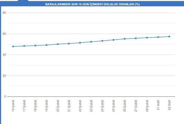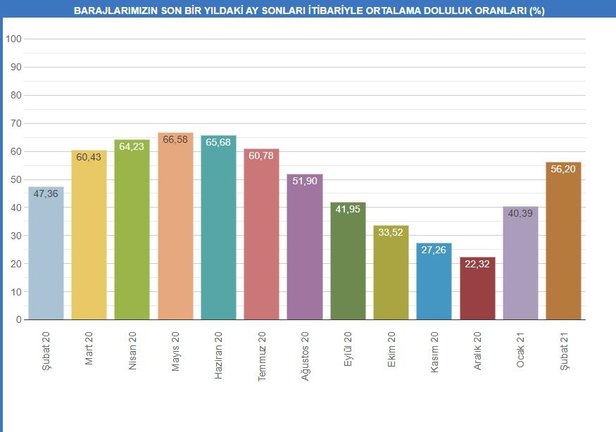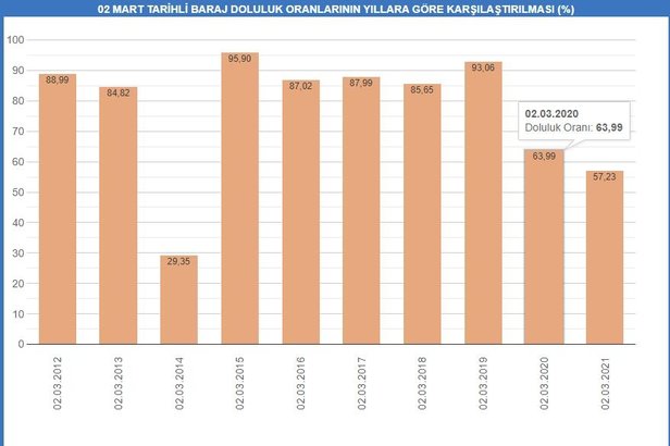 Barajlardaki doluluk oranı, 2 Mart tarihi baz alındığında 2006'da yüzde 98,37, 2007'de yüzde 54,77, 2008'de yüzde 35,57, 2009'da yüzde 79,29, 2010'da yüzde 97,73, 2011'de yüzde 93,01, 2012'de yüzde 88,99, 2013'te yüzde 84,82, 2014'te yüzde 29,35, 2015'te yüzde 95,90, 2016'da yüzde 87,02, 2017'de yüzde 87,99, 2018'de yüzde 85,65, 2019'da yüzde 92,06, 2020'de ise yüzde 63,99 olarak gerçekleşti.