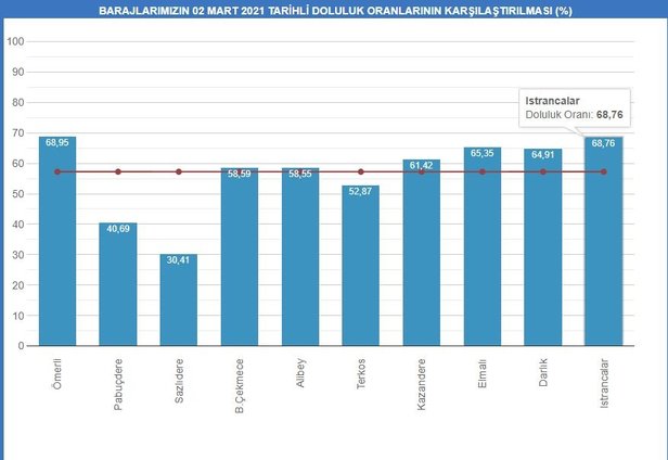 Su miktarı Istrancalar'da yüzde 68,76, Terkos'ta yüzde 52,87, Sazlıdere'de yüzde 30,41, Alibey'de yüzde 58,55, Büyükçekmece'de yüzde 58,59, Ömerli'de yüzde 68,95, Darlık'ta yüzde 64,91, Elmalı'da yüzde 65,35, Kazandere'de yüzde 61,42 ve Pabuçdere'de yüzde 40,69 olarak kaydedildi.