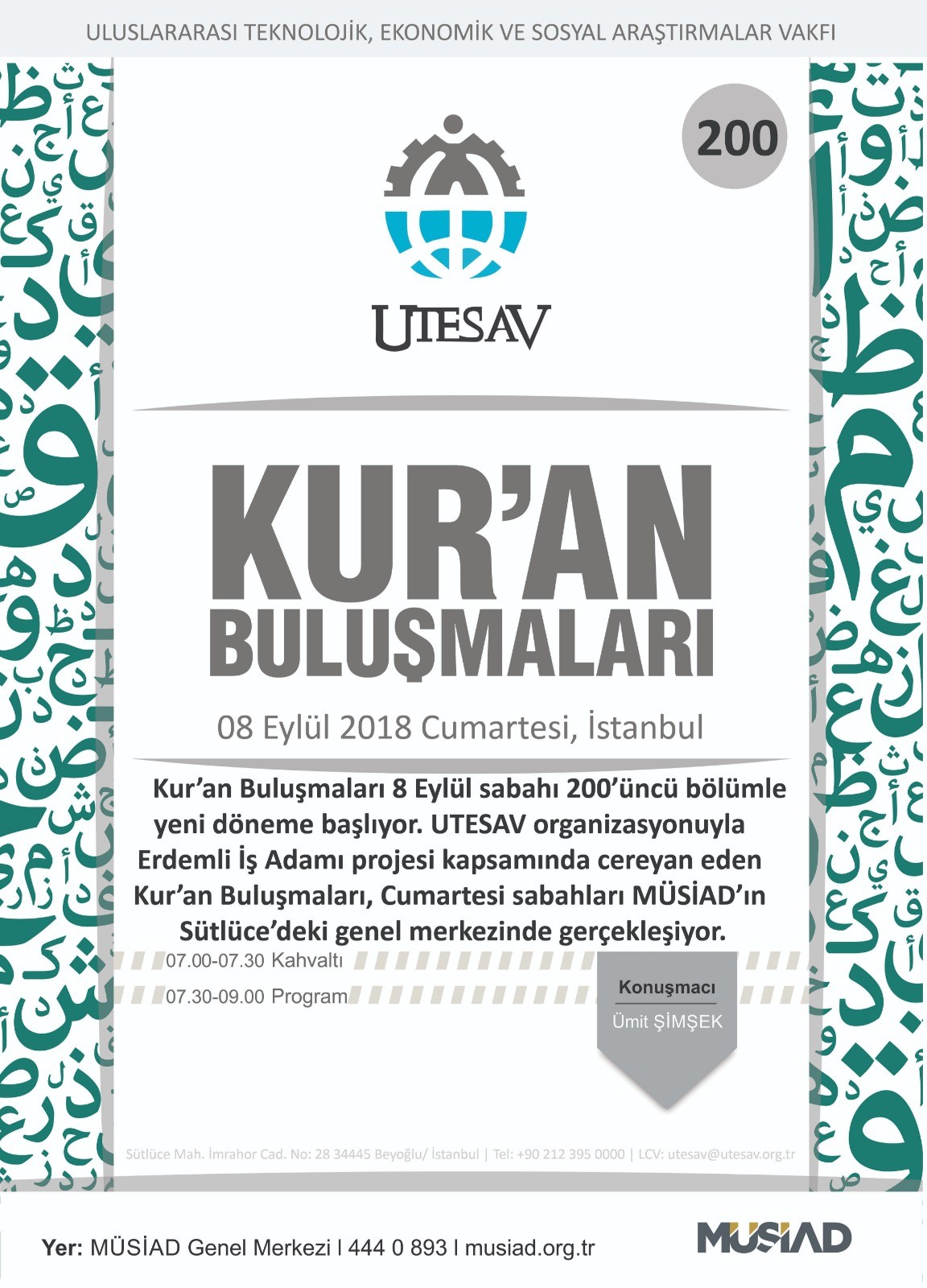 UTESAV organizasyonuyla Erdemli İş Adamı projesi kapsamında cereyan eden Kur'an Buluşmaları, Cumartesi sabahları MUSİAD'ın Sütlüce'deki genel merkezinde başlayacak.