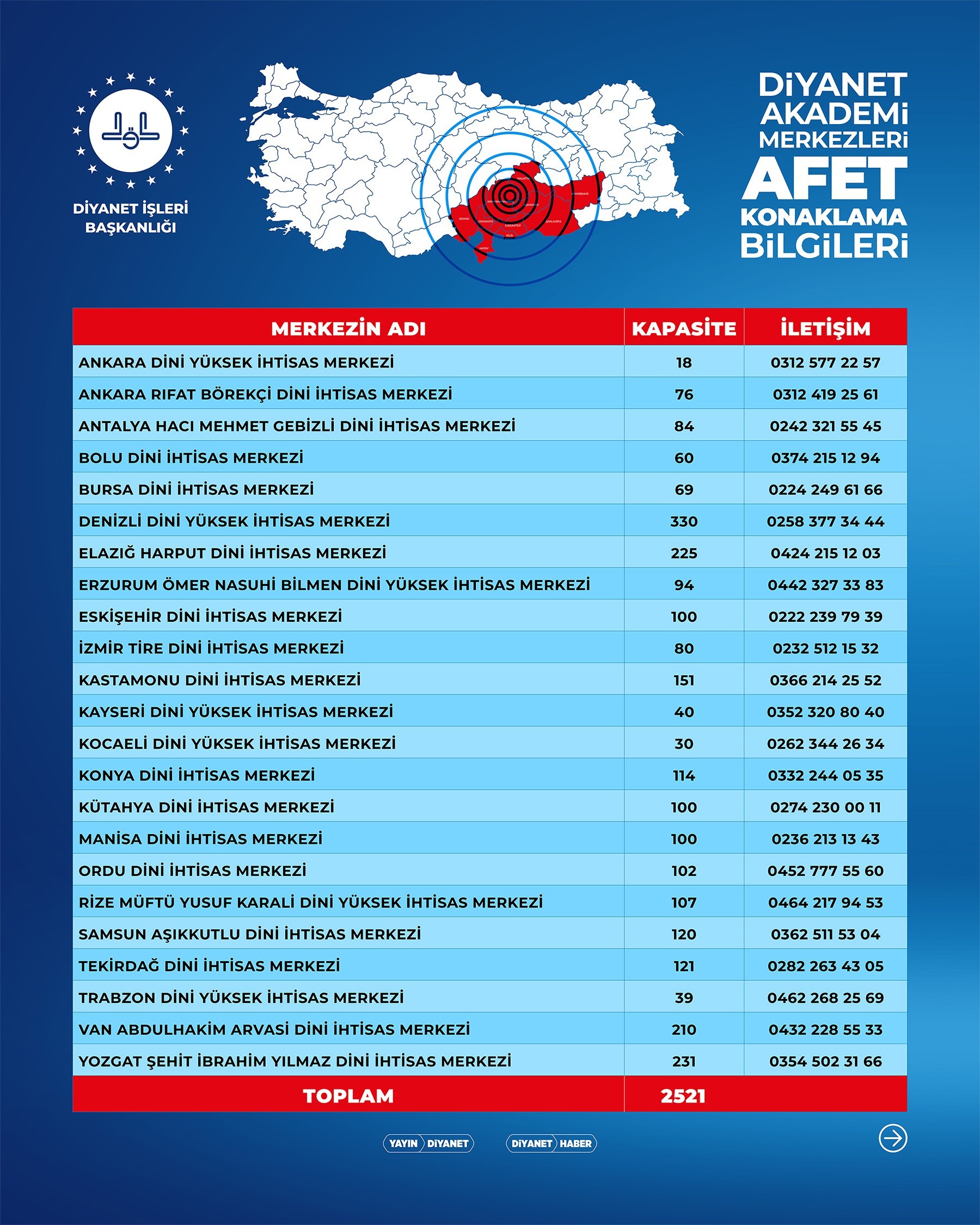 Diyanet İşleri Başkanlığı. Ankara, Antalya, Bolu, Bursa, Denizli, Elazığ, Erzurum, Eskişehir, İzmir, Kastamonu, Kayseri, Kocaeli, Konya, Kütahya, Manisa, Ordu, Rize, Samsun, Tekirdağ, Trabzon, Van ve Yozgat illeri olmak üzere 22 ildeki 23 Dini Yüksek İhtisas Merkezi’nde toplam 2 bin 521 deprem mağdurunun; Antalya’nın Aksu, Döşemealtı, Kepez, Muratpaşa, Alanya, Elmalı; Bingöl Merkez, Solhan, Karlıova; Bitlis Merkez, Tatvan; Erzincan Merkez; Kayseri Hacılar, Kocasinan, Melikgazi; Konya Akşehir, Beyşehir, Çumra, Emirgazi, Hadim, Kadınhanı, Karapınar, Karatay, Meram, Selçuklu, Seydişehir, Sarayönü; Mardin Artuklu, Dargeçit, Kızıltepe, Midyat; Mersin Mut, Akdeniz, Bozyazı, Toroslar, Tarsus, Mezitli, Anamur; Muş Bulanık; Nevşehir Merkez, Acıgöl; Sivas Merkez, Suşehri, Kangal; Niğde Merkez, Bor ilçeleri olmak üzere 12 ildeki 83 Kur’an kursunda toplam 3 bin 124 merkezi depremzedelerin hizmetine açtı.