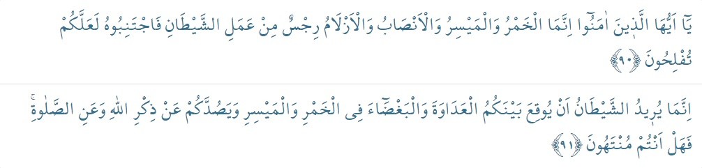 90.Ayet: Ey iman edenler! İçki, kumar, dikili taşlar, fal okları şeytan işi iğrenç şeylerden ibarettir. Bunlardan kaçının ki kurtuluşa eresiniz.