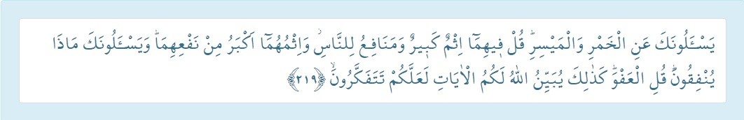 Sana içkiyi ve kumarı soruyorlar. De ki: Bu ikisinde insanlar için büyük zarar ve bazı faydalar vardır; zararları da faydalarından büyüktür. Sana neyi infak edeceklerini de soruyorlar. De ki: İhtiyaç fazlasını. Allah sizin için âyetlerini işte böyle açıklıyor ki düşünesiniz.