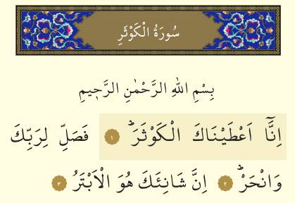 Rahmân ve Rahîm olan Allah´ın adıyla. Şüphesiz biz sana Kevseri verdik. ﴾1﴿ O Halde, Rabbin için namaz kıl, kurban kes. ﴾2﴿ Doğrusu sana buğzeden, soyu kesik olanın ta kendisidir. ﴾3﴿