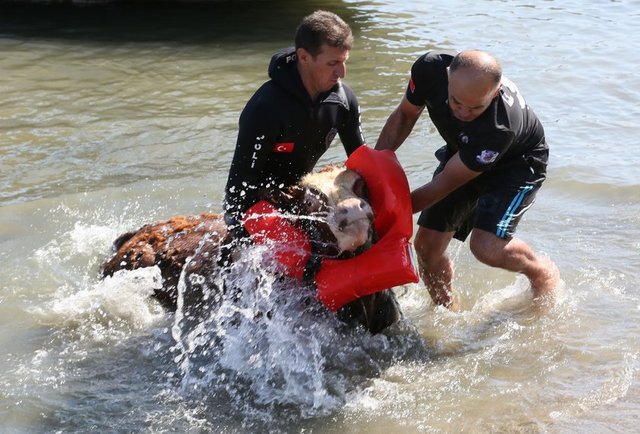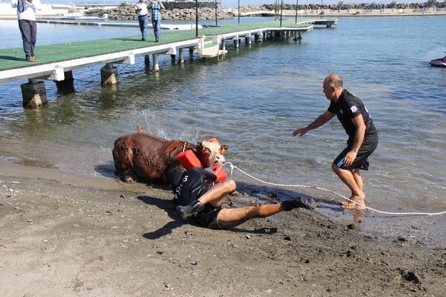 Tosun, boynuna geçirilen iple bota bağlandı, daha sonra da kıyıya doğru çekildi. Polis ve gemi personelinin güçlükle yere yatırıp bağladığı tosun, gemiden gelen iki görevliye teslim edildi.