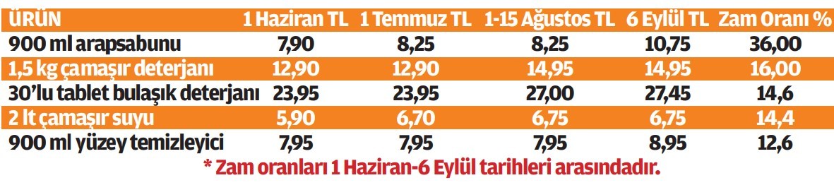 Doların bir ayda rekor üstüne rekor kırması, yüzde 28 artarak 5,24 liradan 6,70 liraya gelmesi marketlere zam olarak yansıdı. Tüketiciyi çileden çıkaran zamlardan temizlik ürünleri de payını aldı. 1,5 kilogram çamaşır deterjanın fiyatı 12-13 liradan 15-16 liraya, bulaşık deterjanının da 5-6 liradan 7-8 liraya çıktı. Şu anda 1,5 litre sıvı sabun 19-20 liradan, yüzey temizleyici ise 8-10 liradan raflarda.