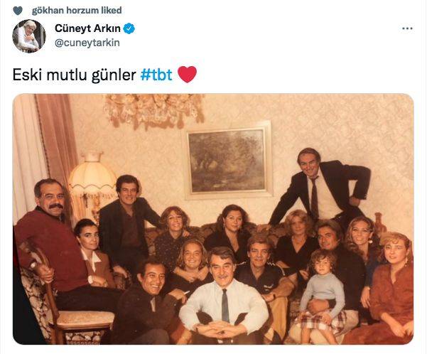 Usta oyuncu Cüneyt Arkın, Twitter hesabından bir fotoğraf paylaştı. Bugün çoğunluğu hayatta olmayan Fikret Hakan, İzzet Günay, Ekrem Bora, Eşref Kolçak ve Orhan Günşiray gibi isimleri bir araya getiren fotoğraf Cüneyt Arkın’ın takipçilerini de geçmişe götürdü. Fotoğraf yüzlerce beğeni ve yorum aldı.