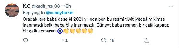 Bir başka takipçi de "Oradakilere baba dese ki 2021 yılında ben bu resmî tiwitliyeceğim kimse inanmazdı belki baba bile inanmazdı Cüneyt baba resmen bir çağı kapatıp bir çağı açmışsın" diye yazdı.