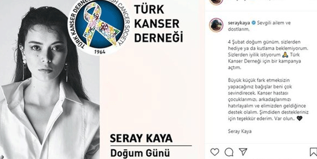 Seray Kaya, sosyal medya hesabından paylaştığı kareye, "4 Şubat doğum günümde sizlerden hediye ya da kutlama istemiyorum. Türk Kanser Derneği'ne yapacağınız bağışlar beni çok sevindirecek" yazdı. Kaya'nın bu hareketi takipçileri tarafından takdir topladı.
