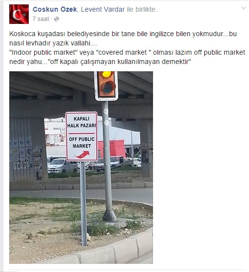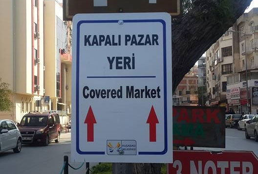 Son olarak kapalı pazar yerine turistleri yönlendirmek için yaptırılan İngilizce tabeladaki anlamsız İngilizce sosyal medyayı salladı. Çoşkun Özer isimli bir vatandaşın fotoğraflayıp, sosyal medyadan yaptığı paylaşım kısa süre içerisinde tüm Kuşadalıların ilgisini çekti. Bir çok kişinin sayfasında paylaştığı fotoğrafta Türkçe “ Kapalı Halk Pazarı “ yazılırken, hemen altına da İngilizce olarak “ Off Puplic Market “ yazılınca vatandaşların belediyenin bu tabelasını ti’ye aldı. Çünkü gerçekte Kapalı Halk Pazarı veya Kapalı Pazar Yeri’nin İngilizce karşılığı, " Indoor Market “" veya "indoor public market" olacaktı. Vatandaşların tepkisi üzerine Kuşadası Belediyesi söz konusu tabelaları bir kez daha değiştirmek zorunda kaldı ve bu kez Türkçe kapalı çarşı anlamına gelen“ Covered Market “ yazdı. Tabelanın 3. kez de doğru şekilde yazılmaması vatandaşların daha da büyük tepkisiyle karşılaştı.